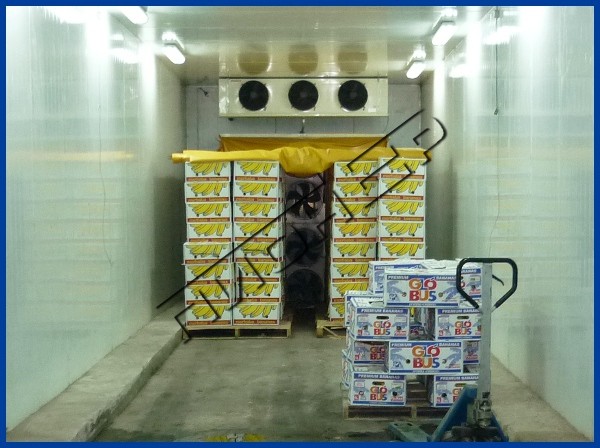 Оптимальные режимы дозревания бананов обеспечиваются системой принудительной продувки воздуха через коробки с бананами. Система гарантирует температурный разброс по массе находящихся в камере бананов.